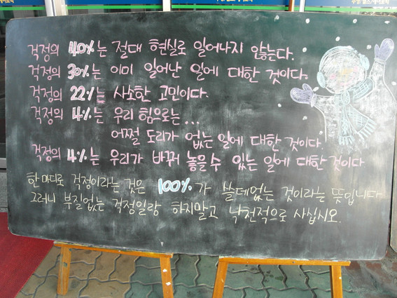영천스포츠센터 입구에 항상 밝은 문구가 눈에 뛴다. 이 문구는 스포츠센터에서 매월 희망적이고 긍정적인 글을 다양하게 칠판에 쓰고 전시해 두고 있는데, 하루 천명 이상 고객들이 글을 읽으며 밝고 좋은 마음을 가지게 도움을 주고 있어 호평을 받고 있다.