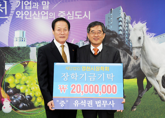 지역에서 기부하는 천사로 널리 알려진 유석권 법무사가 지난 26일 영천시장학회(이사장 김영석)에 장학기금 2000만원을 기탁했다. 영천 경찰발전위원회 행정위원장을 맡고 있는 유석권 법무사는 “고향에서 개업할 당시 한사람의 월급만큼 더 뛰겠다는 생각을 했고, 여기서 절약한 돈을 지역에 환원하자고 나 자신과 약속했다.”며 기부 실천의 배경을 설명했다. 또 “우리 아이들이 좋은 교육환경에서 자라고 우수학생들이 더욱 실력을 키워 갈 수 있도록 장학회가 더 발전했으면 좋겠다. 더불어 더 많은 지역 출신의 인사들이 영천사랑에 동참하면 학생들이 지역에서 더 큰 꿈을 키울 수 있는 좋은 교육환경을 만드는데 도움이 될 것”이라고 기부문화를 강조하였다.