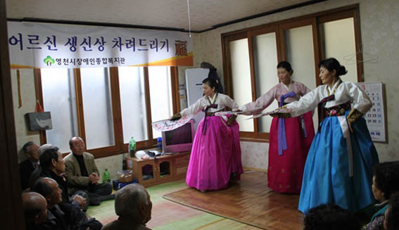 영천장애인복지관은 지난 5일 홀로어르신 생신상 차려드리기 행사를 진행했다. 이날 행사에는 의용소방대회원들과 아름 봉사단이 함께 참여하여 완산동 남부경로당의 어르신 30여명이 참석하여 민요와 장고춤 등 흥겨운 시간을 보냈다.