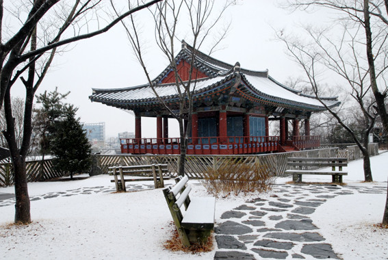 오랜만에 내린 눈에 출근길은 힘들었지만 눈 덮인 조양각과 설경은 아름답기만 하다.