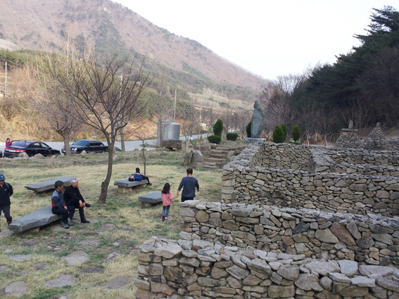 보현산 남쪽 산자락에 고즈넉이 자리 잡고 있는 거동사는 신라의 의상대사가 창건하였다고 전하며 조선시대까지도 큰 사찰이었다고 하는데 거동사의 대웅전이 유형문화재 제 137호로 지정될 만큼 그 문화적 가치가 큰 천년사찰이며 전통사찰이라고 한다. 거동사 아래 등산로에 ‘돌공원’이 조성되어 지나가는 사람들의 발길을 붙잡는다. 조약돌로 미로를 만들어놓고 돌탑 쌓기 체험장과 바둑판식 고인돌 그리고 달마대사를 빼닮은 커다란 바위가 등산객들의 눈길을 사로잡아 잠시 쉬어갈 수 있는 휴식처가 되어준다.
