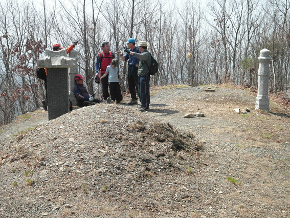 정상에서 기념사진을 찍고 정상 표석을 살펴보니 고경면 기관단체에서 설치한 표석의 정상 높이는 578m, 다른 단체에서 세운 표석의 정상 높이는 670m를 기록, 탐사대의 전자 GPS (고도)측정기는 606m를 기록하고 있었다.