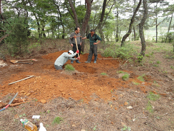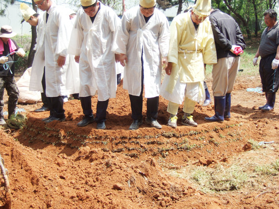 지난 1일 매장을 준비하던 청통면 애련리 현장에는 전우식 명당기풍수연구소장과 일하는 사람들이 열심히 제열하고 땅을 파고 있었다.